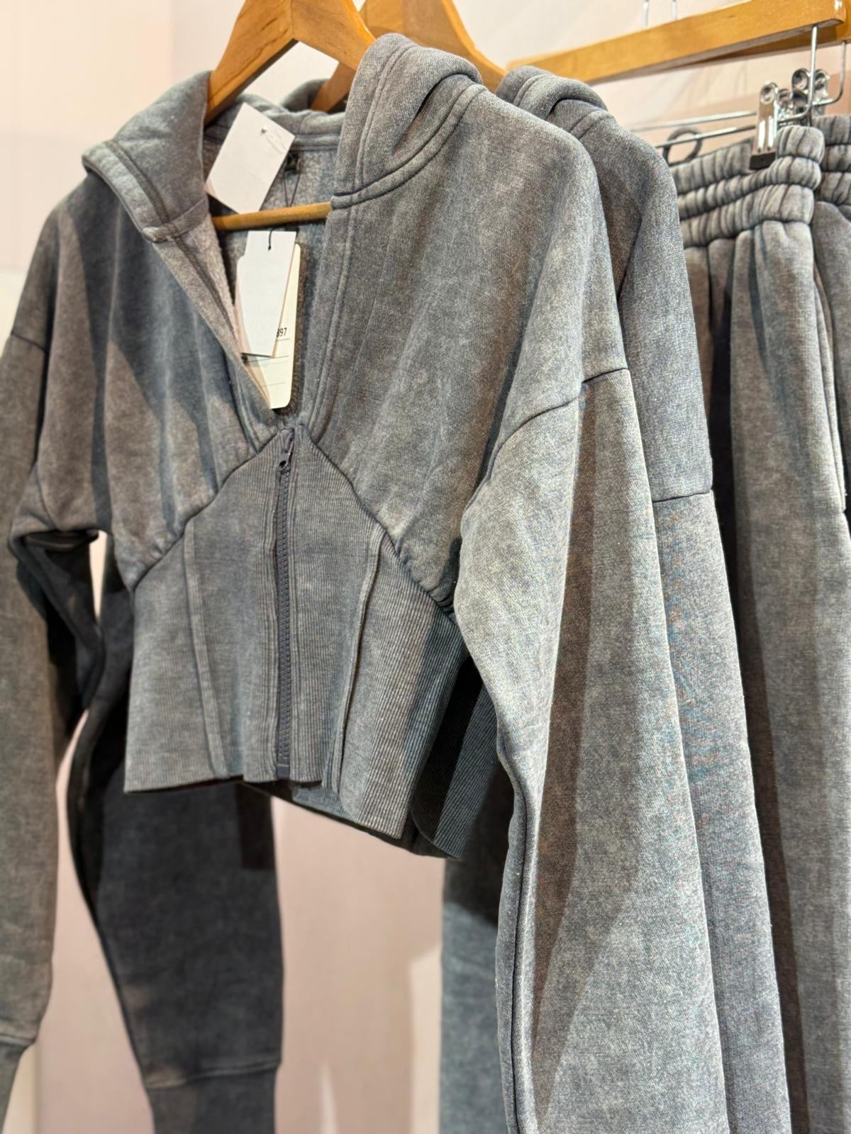 Acid Wash Jersey Suit with a Corset Style Hoodie and Wide Leg Drawstring Pants with Pockets