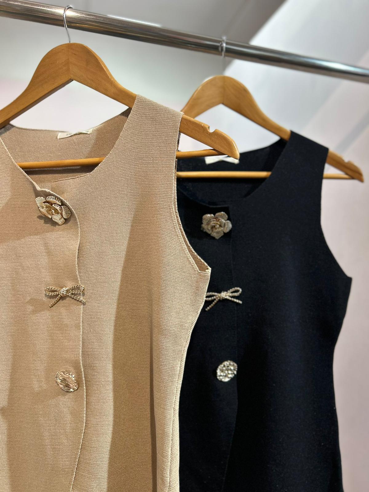 Thin Knit Waistcoat with Flower and Bow Button Detail