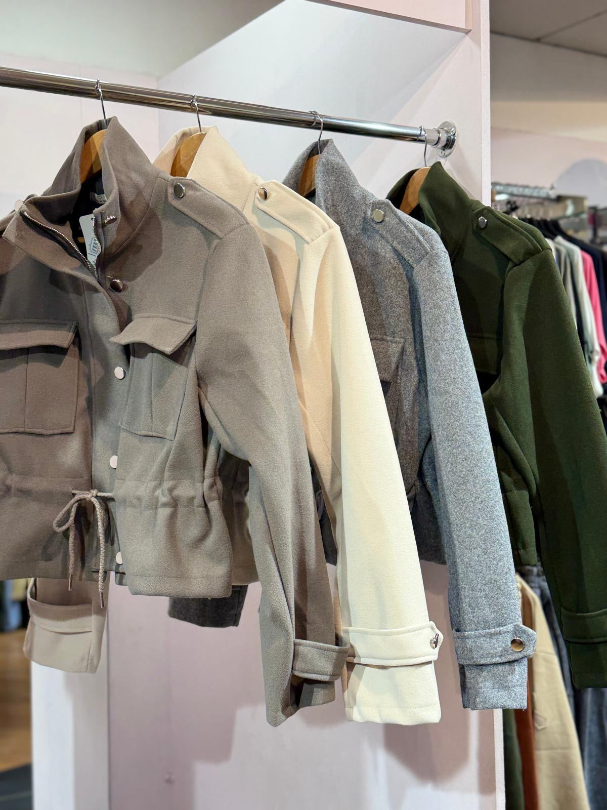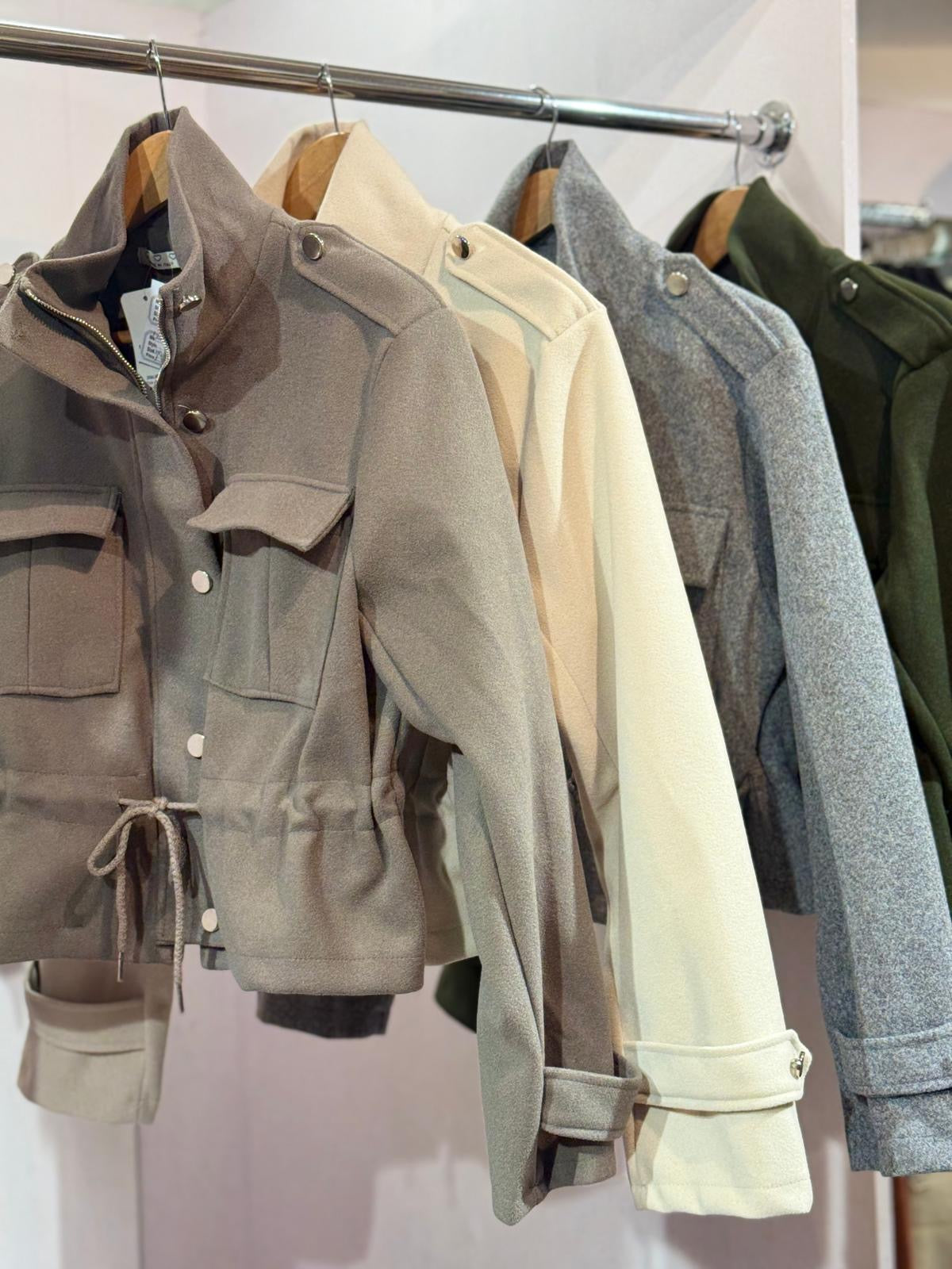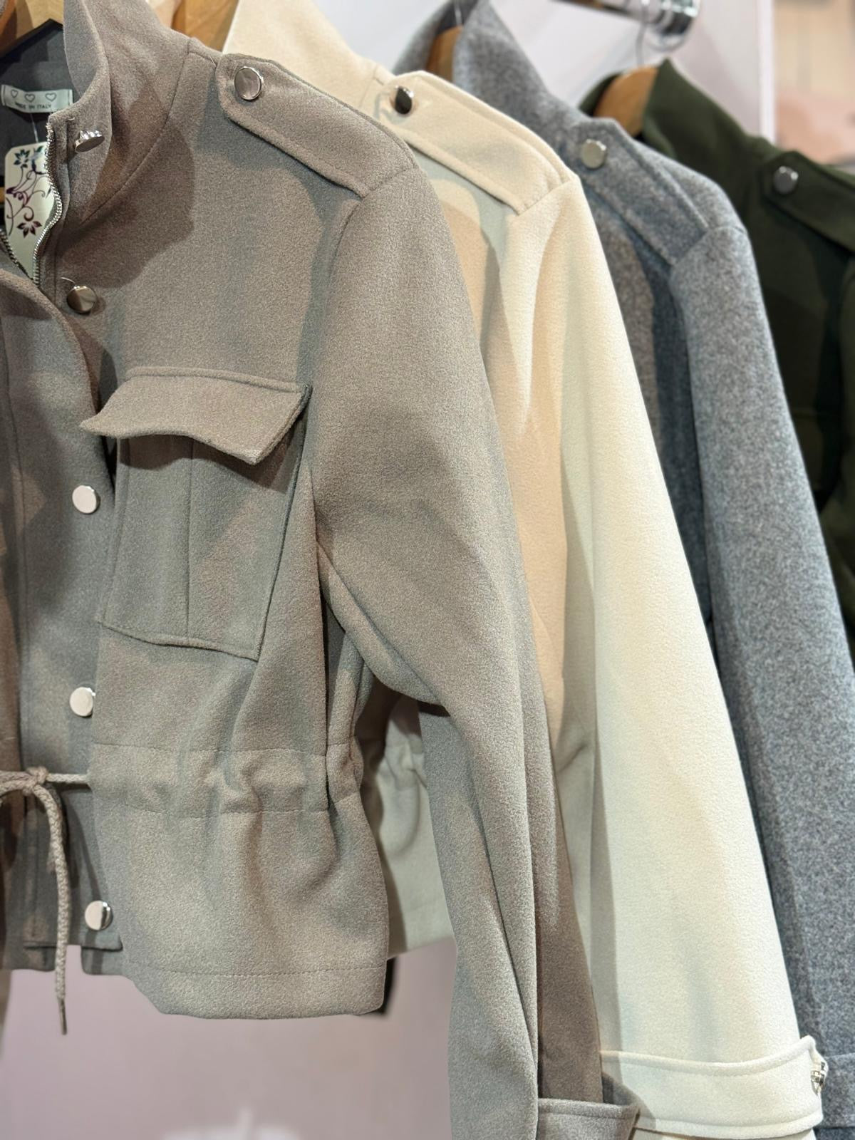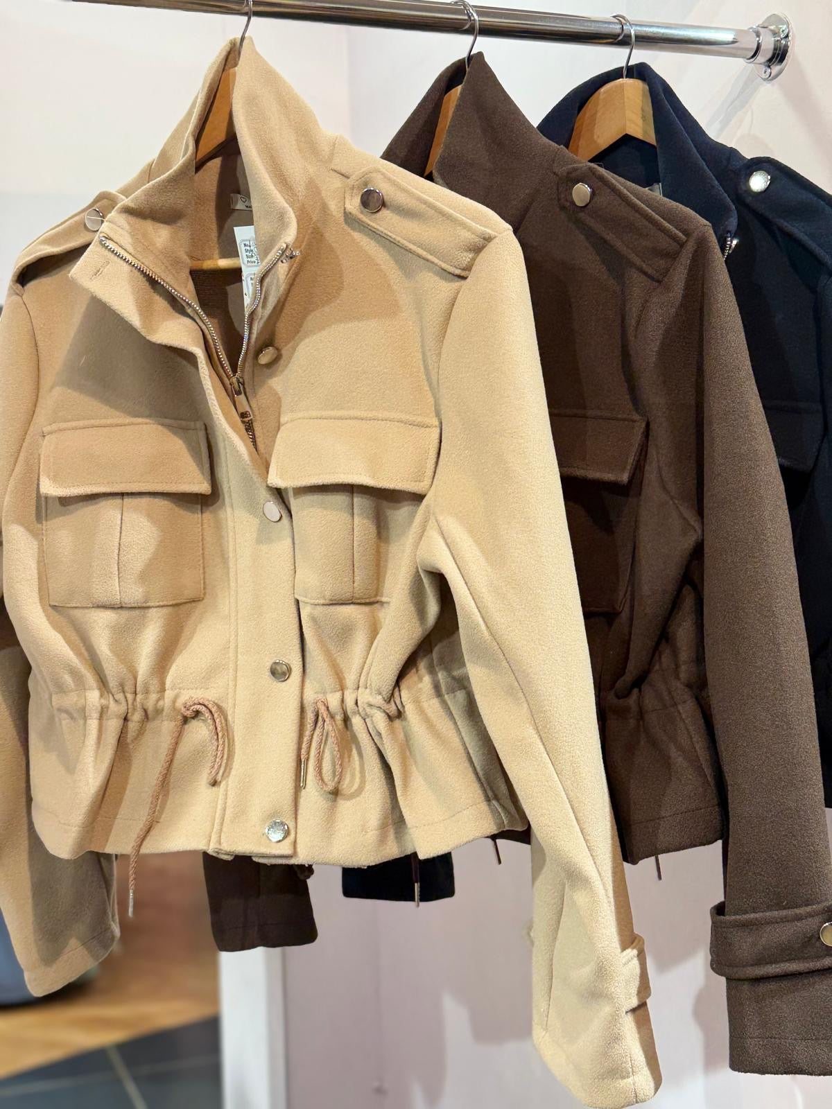Drawstring Zip/Button Crop Jacket with Breast Pocket Detail