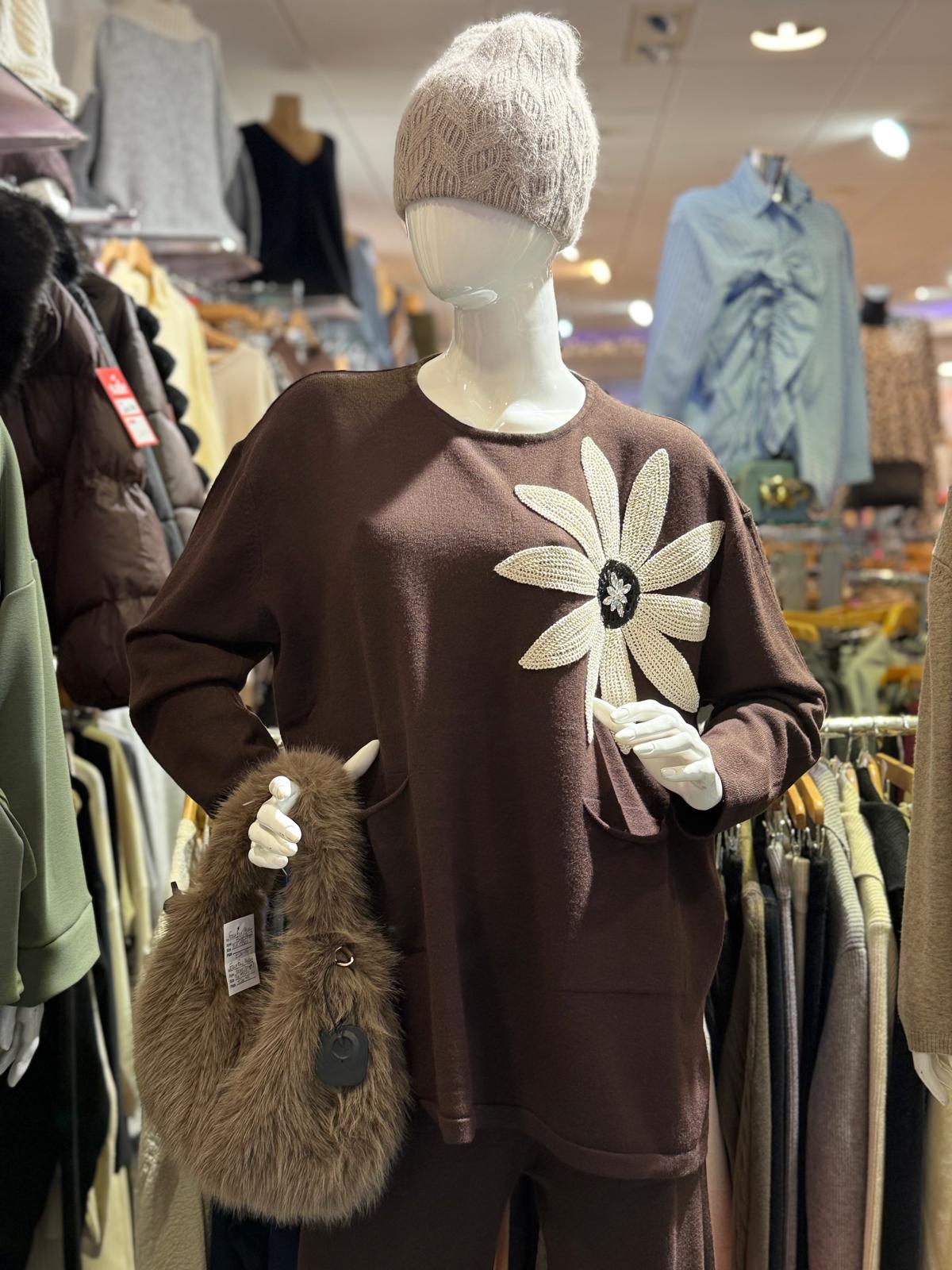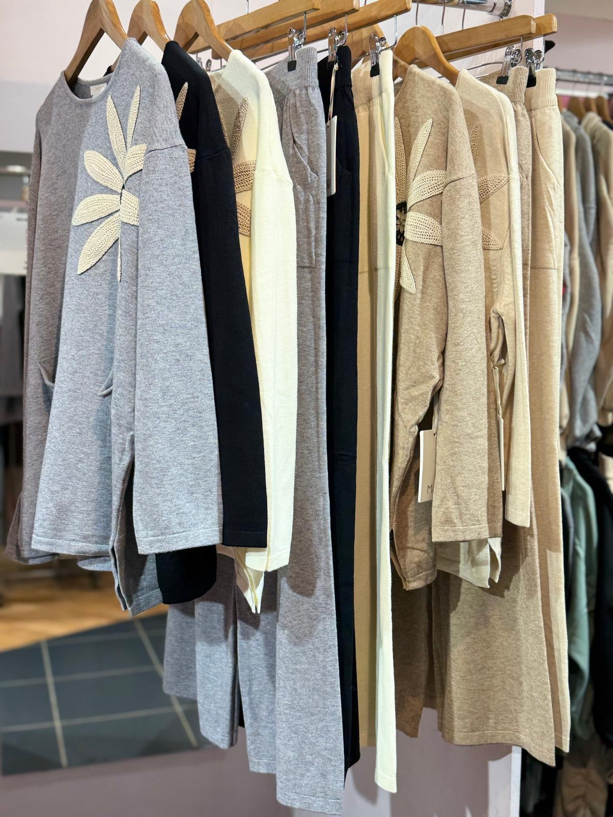 Thin Knit Suit with Two Front Pockets and Sunflower Diamante Detail with Wide Leg Pocket Pants