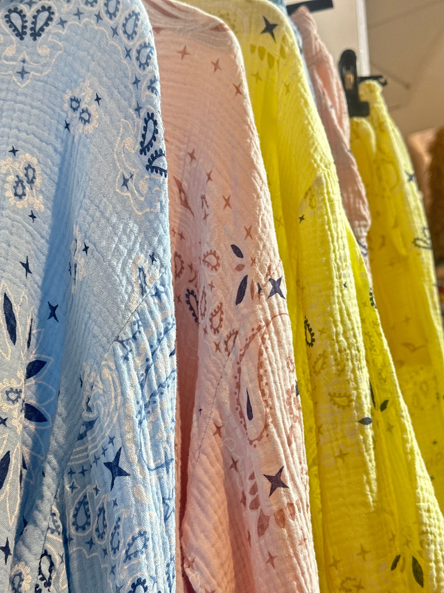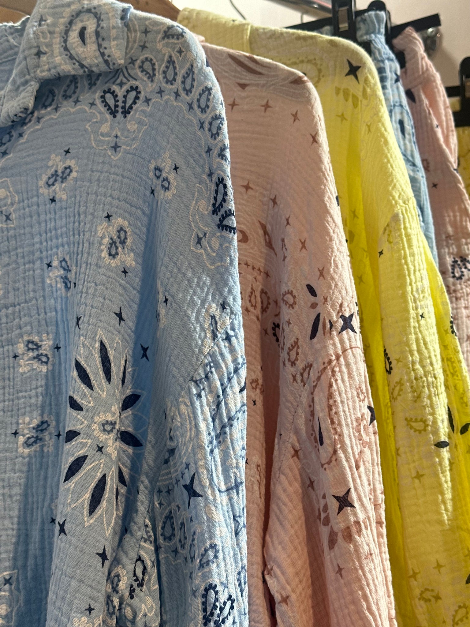 Cheesecloth Trouser Suit with Button Through Shirt and Drawstring Pants in a Paisley Pattern