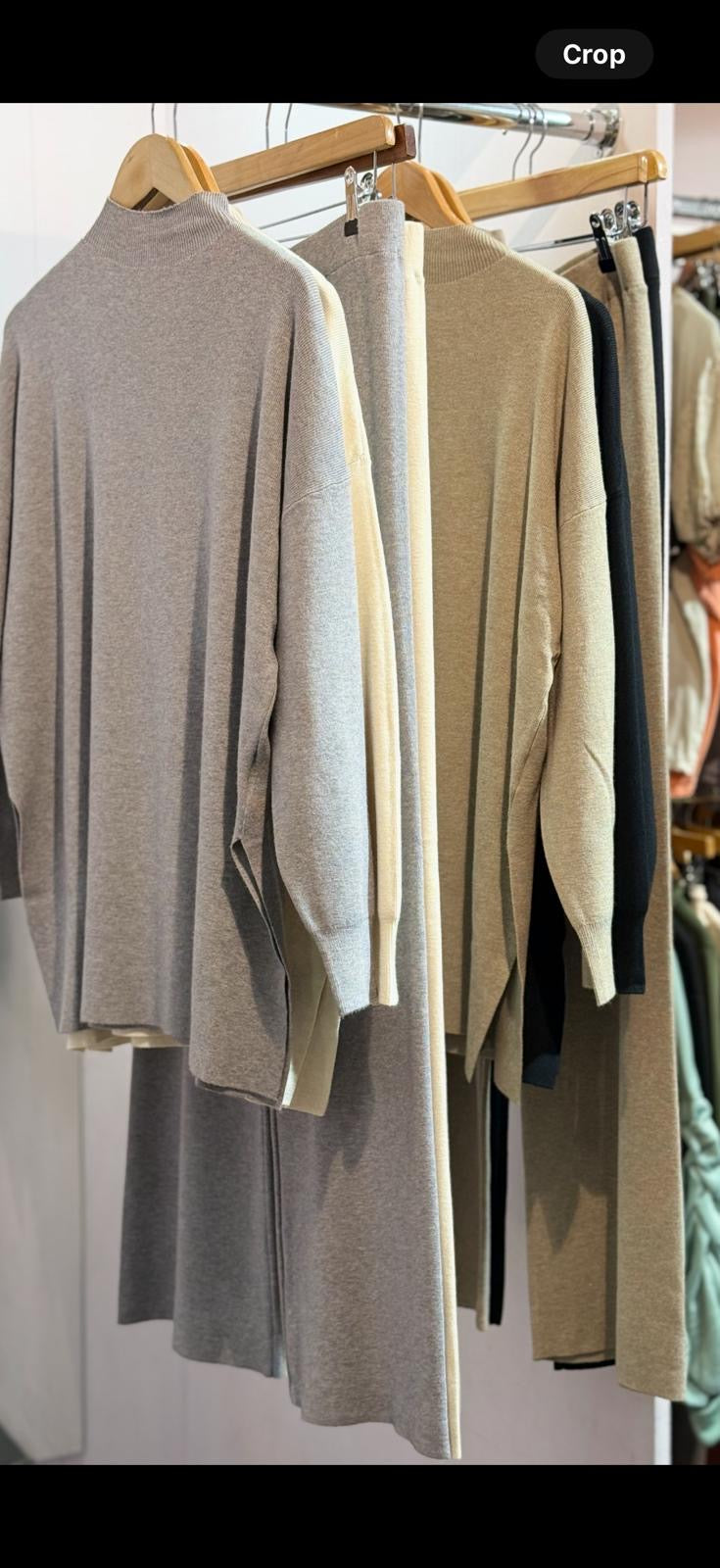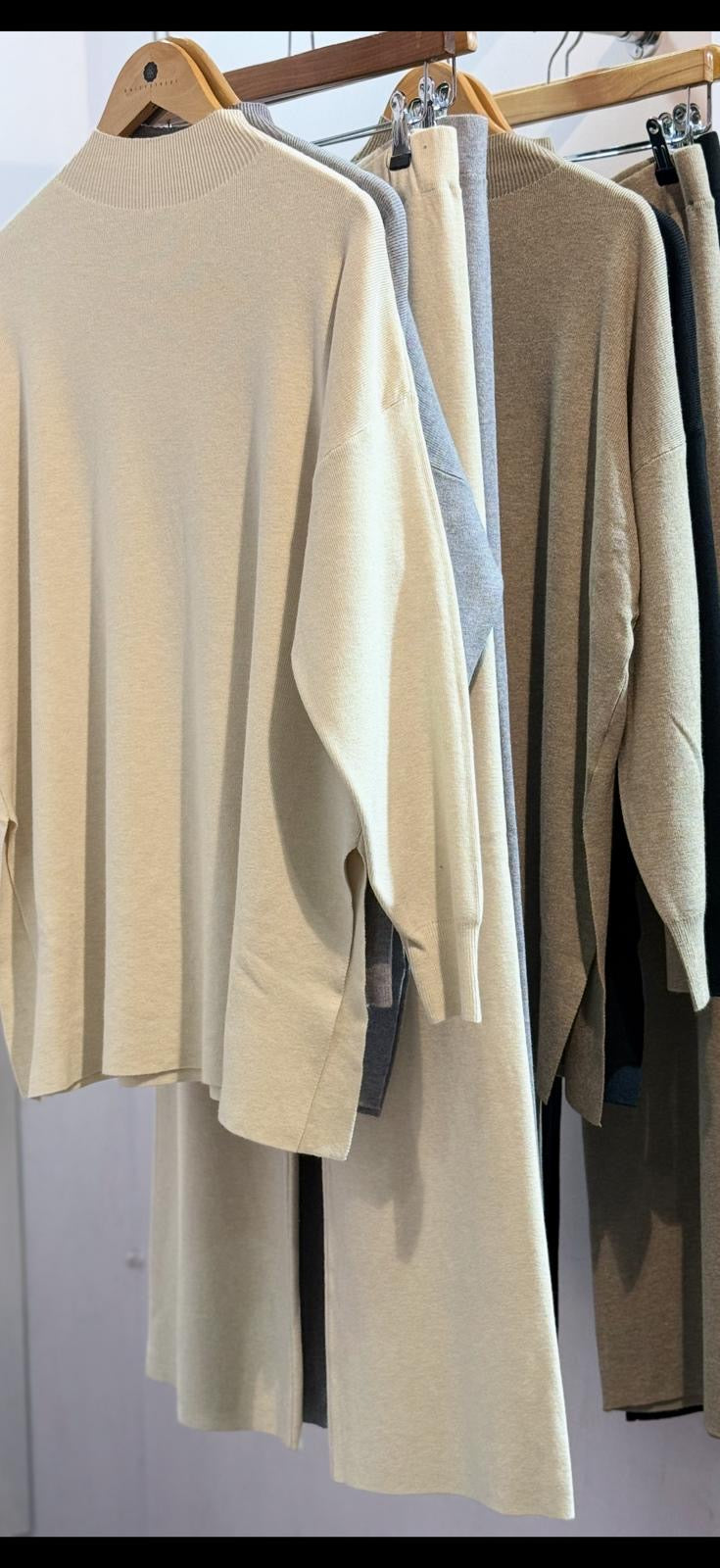 Thin Knit Pant Suit with Turtle Neck Long Top with Side Splits and Wide Leg Pants